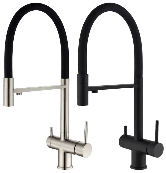 Die ALPINA 3-Wege-Armatur kombiniert Warm- und Kaltwasser mit einer separaten Leitung für gefiltertes Trinkwasser in einem klaren, funktionalen Design. Gefertigt aus massivem Edelstahl 304 und ausgestattet mit flexiblem, abnehmbarem Auslauf, bietet sie hohe Bewegungsfreiheit und komfortable Handhabung im Küchenalltag. Ideal für Trinkwasser- und Umkehrosmosefiltersysteme.