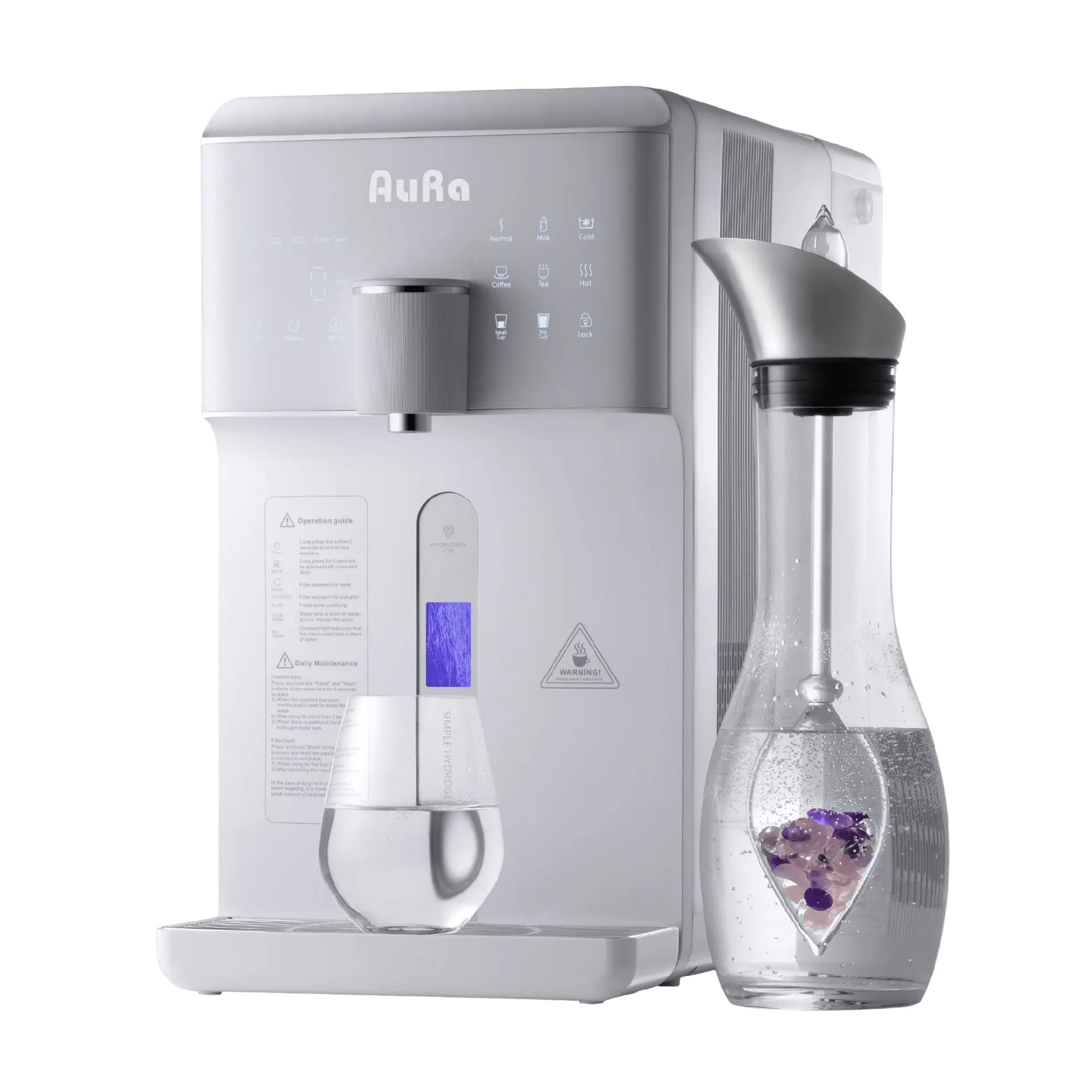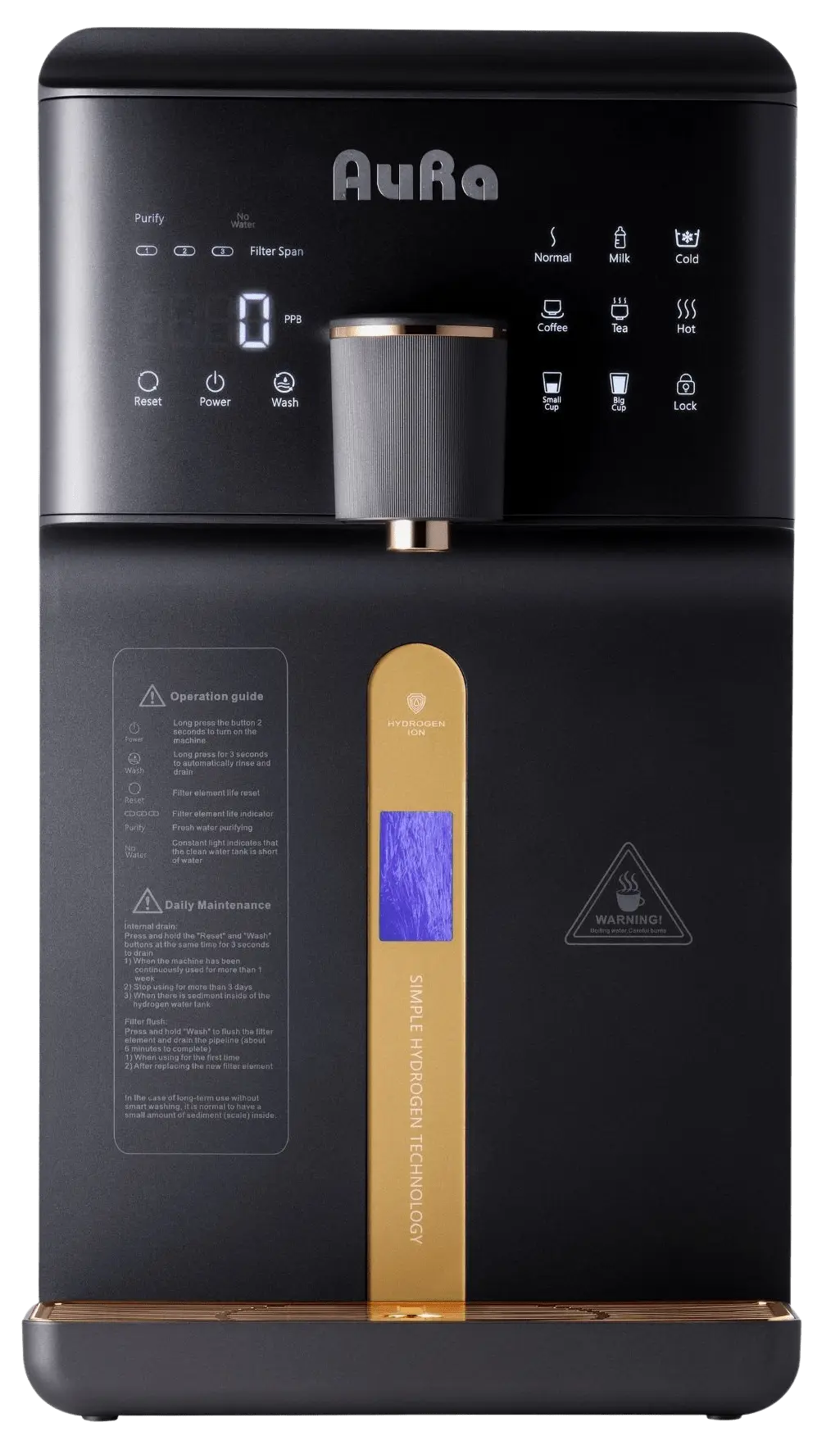 Die AURA® W23 ist eine kompakte und elegante Auftischanlage mit 4-in-1-Funktion: Umkehrosmose, Hydrogenwasser, Heiß- und Kaltwasser – alles integriert in einem mobilen System mit eigenem Tank. Ideal für Zuhause, unterwegs oder überall dort, wo kein Festwasseranschluss verfügbar ist.