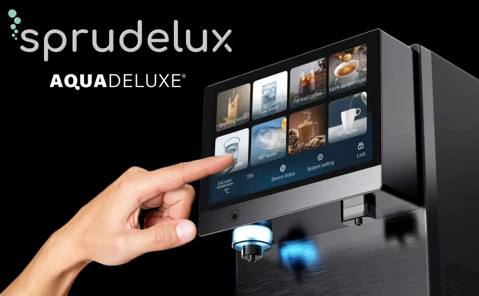 Der SPRUDELUX PRO TOUCH vereint modernste 5-in-1 Technologie – Umkehrosmose, Kühlung, Sprudeln, Erhitzen und UV-Desinfektion – in einem eleganten Gerät für Zuhause oder Büro.